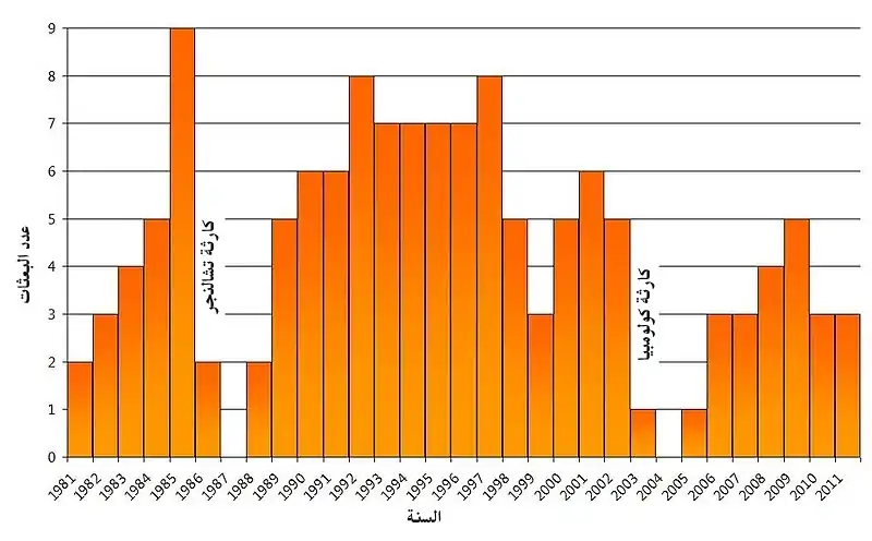 | البعثة | التاريخ | المهمة | المكوك | الطاقم | مدة التجربة | قاعدة الانطلاق | ملاحظات | مصادر |