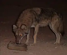 الذئب العربي![]() | Canis lupus arabs | الكلبيات | الذئب العربي ذئبٌ صغير الحجم وينتشر في أغلب مناطق المملكة ما عدا صحراء الربع الخالي وبعض أجزاء صحراء النفود، وينشط ليلاً ويصطاد في جماعة وله حاسة شم قوية. أعداد الذئب العربي في تناقص لأنه يتعرض للقتل على يد سكان البادية لأنه يفترس المواشي. | [5] |