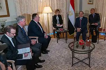 | 17 | واشنطن العاصمة | 9 - 10 أبريل | دونالد ترامب | بحث تطوير العلاقات المصرية الأمريكية من خلال عقد لقاءات مع رئيس الولايات المتحدة دونالد ترامب وكبير مستشاري الرئيس جاريد كوشنر ووزير خارجية الولايات المتحدة مايك بومبيو ومستشاؤة الرئيس إيفانكا ترامب ، بالإضافة إلى لقاء مديرة صندوق النقد الدولي كريستين لاغارد لبحث تطورات تنفيذ برنامج الإصلاح الاقتصادي في مصر. | [19] | |