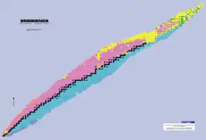 المحور الأفقي يعطي عدد البروتونات في نواة الذرة ، والمحور الرأسي يعطي عدد النيوترونات في نواة الذرة . المربعات السوداء تبين العناصر المستقرة (أي الغير مشعة) . والمربعات الزرقاء تبين عناصر يكون فيها عدد النيوترونات أكبر من عدد البروتونات ، فهي لذلك تكون عناصر مشعة تصدر أشعة بيتا. والمربعات البنفسجية تبين عناصر في نواتها عدد بروتونات كبير بالنسبة لعدد النيوترونات ، فهذه تكون مشعة بإصدارها بوزيترون (إلكترون موجب الشحنة). الألوان الأخري تعبر عن أنواع نشاط إشعاعي أخرى ؛ فمثلا المربعات الصفراء تبين عناصرا تصدر أشعة ألفا.