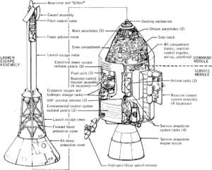 رسم هندسي لمركبة الفضاء Command Modul ومتصل بها وحدة الخدمات Service Modul ذات الصاروخ الرئيسي.