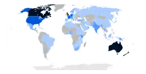 الرحلات الخارجية التي قامت بها إليزابيث الثانية. يشير اللون الداكن إلى عدد أكبر من الزيارات