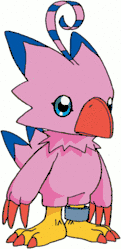 | هديل | بايومون | طفل | هو طير رقميّ لونه وردي أشبه بطائر الهدهد، ذو منقار أحمر وأرجلٌ صفراء، تُخرج دوامةً خضراء من جناحيّها لتُهاجم به أعدائها. | ![]() |