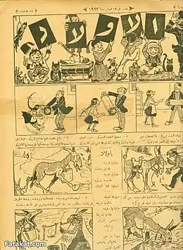 الأولاد | 1922م | مجلة الأولاد هي مجلة مصرية نصف شهرية، صدر العدد الأول منها عام 1922م، ليست هناك إشارة إلى الناشر أو اسم رئيس التحرير. توجه إلى سن من ستة أعوام إلى 16 عاماً، وهي تعتمد على قصص كرتونية مترجمة ومرسومة في مجلات أخرى عالمية، ليست هناك مقدمة ولا أسماء تحريرية، وتتسم المجلة بغرابة عناوين قصص الكرتون مثل "عبود وابنه بياضة واللي جرى له من ألعاب الرياضة" و"حاريتو وماريان ودقماقة ومعركة الثيران".[1]