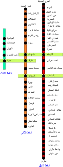 - "خطوط المترو". cairometro.gov.eg/. مترو القاهرة. مؤرشف من الأصل في 28 يناير 2018. اطلع عليه بتاريخ 24 ديسمبر 2016. الوسيط