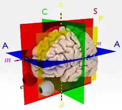 - المستوى السهمي (بالإنجليزية: Sagittal)، هو مستوىً رأسيّ يمُر بين فتحتي الأنف، وبين نصفي الكرة الدماغية، ويقسم الدماغ إلى نصفين : النصف الأيسر والنصف الأيمن، ويحتوي على المحور الوسطي (بالإنجليزية: medial) و المحور الظهري-البطني (بالإنجليزية: dorsoventral) للدماغ. المستوى المجاور للسهمي (بالإنجليزية: parasagittal plane) هو أي مستويً موازٍ للمستوى السهمي.