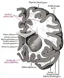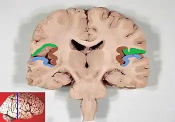 و قشرة الجزيرة (بالإنجليزية: insular cortex) (البني).