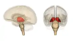 - المِهاد أو الثلاموس (باللاتينية: Thalamus) هو الجزء الأكبر من الدماغ البيني يقع على جانبي البطين الثالث بصورة جسمين ذوي شكل بيضاوي. يقع المهاد فوق الوطاء (تحت المهاد) بجانب وسط نصف كرتي المخ. يعمل كمحطة توصيل بين كثير من المعلومات التي تدخل قشرة المخ وتخرج منها.[9]
