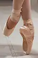 الحركة التي تقدمها راقصة الباليه في الصورة ، مثال على ثني اخمصي للقدم اليسرى (plantar flexion).