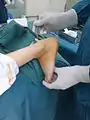 صورة أثناء اجراء جراحة على وتر العرقوب (Achilles tendon) لإطالته من أجل تحسين المشي والوقوف ، و تُرى القدم في حالة انثناء ظهراني (أو ثني خلفي) (dorsiflexion).
