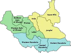 ولايات جنوب السودان العشرة، مجمعة في الأقاليم الثلاثة التاريخية للسودان.