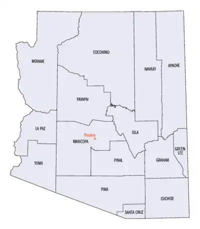 | مقاطعة ماريكوبا | 013 | فينكس | 1871 | أجزاء من مقاطعتي بيما ويافاباي. | ماريكوبا، شعب من السكان الأصليين لأمريكا | 3٬072٬149 | 23,891 كم² (9,224 ميل²) | ![]() |