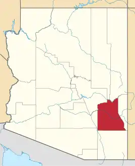 | مقاطعة كوتشايز | 003 | بيزبي | 1881 | جزء من مقاطعة بيما. | كوتشايز، قائد جمعة السكان الأصليين لأمريكا الأباتشي. | 117٬755 | 16,107 كم² (6,219 ميل²) | ![]() |