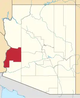 | مقاطعة لا باز | 012 | باركر | 1983 | جزء من مقاطعة يوما | لاباز، أريزونا، قرية تأريخية على نهر كولورادو وتعني السلام في اللغة الإسبانية. | 19٬715 | 11,690 كم² (4,513 ميل²) | ![]() |