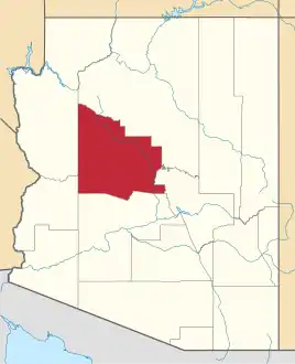 | مقاطعة جيلا | 007 | غلوب | 1881 | أجزاء من مقاطعتي ماريكوبا وبينال. | نهر جيلا، نهر يجري خلال أريزونا. | 51٬335 | 12,421 كم² (4,796 ميل²) | ![]() |