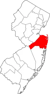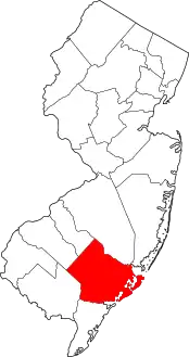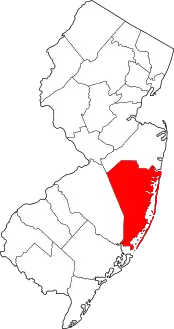 | مقاطعة أتلانتك | 001 | ماي لاندينج | 1837 | مقاطعة غلوستر | المحيط الأطلسي، الذي يشكل الحدود الشرقية للمقاطعة | 489.39 | 274,549 | 561 ميل مربع (1,450 كـم2) | ![]() |
