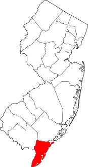| مقاطعة كيب مي | 009 | كيب ماي كورت هاوس | 1692 | مقاطعة برلنغتون | أحد مستكشفين القرن ال17: الهولندي كورنيليوس جاكوبسن مي، الذي أستكشف ومسح خليج ديلاوير جنوب المقاطعة | 381.43 | 97,265 | 255 ميل مربع (660 كـم2) | ![]() |