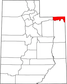 | مقاطعة وينتاه | 047 | فيرنال (يوتا) | 1880 | جزء من مقاطعة واساتش | وينتاه عصابة من قبيلة يوت الذين عاشوا في المنطقة | 32,588 | 4,480 ميل مربع (11,600 كـم2) | ![]() |