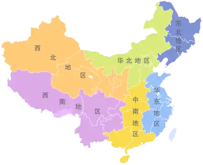 | غرب الصين | 3,978,700 كم² | 289,623,281 | 73/كم² | تشونغتشينغ، سيتشوان، قويتشو، يونان، التبت، شنشي، قانسو، تشينغهاي، نينغشيا، سنجان |