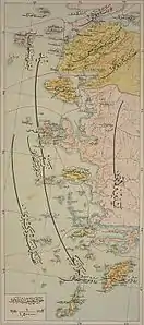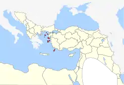 لا أقضية | 1867م | 1913م نزعت مُعاهدة لندن القسم الغربي منها ومنحتها لِمملكة اليونان، انتقلت الجُزر الشرقيَّة لاحقًا إلى حوزة الجُمهوريَّة التُركيَّة.[22] |