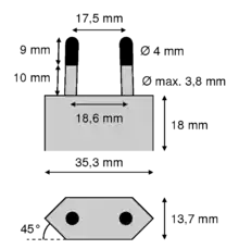 يصل طول قطب القابس حوالي 19 ملم، يتكون كلا من موصل بطول 9 ملم تقريبا بقطر 4 ملم مع نهايات مستديرة يليها عمود عازل مرن طوله 10 ملم لا يزيد قطره عن 3.8 ملم. القطبان غير متوازيان تماما فهما متقاربان قليلا، يبعد مركز كل منها عن الأخر 17.5 ملم بينما من منتصف القمة الدائرية في أعلى نقطة حوالي 18.6 ملم. يبلغ عرض القابس بأكمله 35.3 ملم وارتفاعه 13.7 ملم. جانبي القابس الأيسر والأيمن على زاوية 45° من المستوى الأفقي.[1]