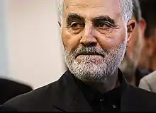 اللواء قاسم سليماني (بالفارسية: قاسم سلیمانی) (11 مارس 1957 - 3 يناير 2020) كان عسكرياً إيرانياً وقائداً لفيلق القدس من 1998 خلفاً لأحمد وحيدي حتی مقتله.[7] وهي فرقة تابعة للحرس الثوري الإيراني والمسؤولة أساسا عن العمليات العسكرية والعمليات السرية خارج الحدود الإقليمية.[8] وهو من قدامى المحاربين في الحرب العراقية الإيرانية في الثمانينيات، خلال الحرب العراقية الإيرانية، قاد فيلق 41 ثار الله (وهو فيلق محافظة كرمان).[9] في 24 كانون الثاني/ يناير 2011 رقيت الرتبة العسكرية لقاسم سليماني من عقيد إلى لواء بواسطة قائد الثورة الإيرانية علي خامنئي.[7][10] كان سليماني نشطا في العديد من الصراعات في بقية أنحاء الشرق الأوسط، وخاصة في العراق والشام، مع الحفاظ على مستوى منخفض. وكانت أساليبه مزيجا من المساعدة العسكرية للحلفاء الأيديولوجيين والدبلوماسية الإستراتيجية الصعبة. وقد قدّم منذ فترة طويلة مساعدات عسكرية للشيعة والجماعات الكردية المناهضة للرئيس صدام حسين في العراق وحزب الله في لبنان وحركة حماس في الأراضي الفلسطينية. في عام 2012، ساعد سليماني في دعم الحكومة السورية، خلال الحرب الأهلية السورية. كما ساعد سليماني في قيادة قوات الحكومة العراقية والحشد الشعبي المشتركة التي تقدمت ضد الدولة الإسلامية في العراق والشام (داعش) في 2014-2015.[11] كان سليماني يحظى بشعبية كبيرة بين الإيرانيين، حيث اعتبره مؤيدوه "بطلاً نكران الذات يقاتل أعداء إيران".[12][13]