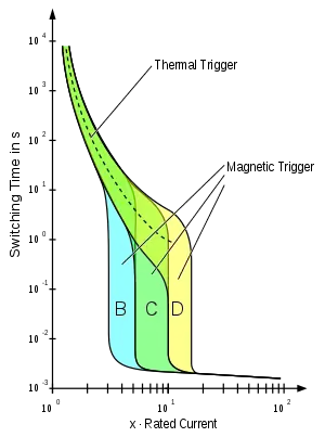 - النوع B يقطع ما بين 3 إلى 5 مرات من تيار الحمل الكامل.