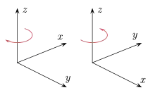 عند اختيار ثلاثة متجهات والتي يجب أن تكون متعامدة على بعضها البعض، يوجد حلان مميزان، ولذلك عند التعبير عن هذه الفكرة في الرياضيات، يجب إزالة هذه الغموض ومعرفة أي قاعدة معنية.