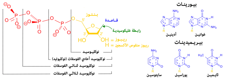 الأدينين والغوانين ينتميان إلى تصنيف جزيئات ذات حلقتين، تسمى بورين (ويختصر بالحرف R). وتنتمي سايتوسين وثيامين ويوراسيل إلى تصنيف بيريميدين (وتختصر الحرف Y).