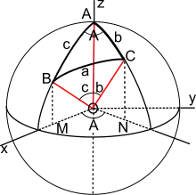 هنا، α، و β، و γ هي الزوايا المركزية (الواقعة في مركز الكرة) التي تقابلها ثلاثة أقواس لمثلث السطح الكروي a، وb و c، على التوالي. A، وB، و C هي زوايا السطح المقابلة لأقواسها.