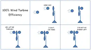 يوضح قانون بيتز أنه لا يمكن أن تصل كفاءة أي توربين أعلى من 59.3%. نستطيع شرح القانون بافتراض أنه إذا استخرج توربين رياح كامل الطاقة الحركية للهواء القادم إليه فستصل سرعة الهواء إلى صفر خلف التوربين، بالتالي إذا سكنَ الهواء خلف التوربين لا يأتي تيار هواء جديد عبر التوربين فسيتوقف عن العمل؛ لإستمرارية عمل التوربين يجب أن تكون هناك سرعة رياح عبر وبعد التوربين لا يتجاوز استخراج الطاقة الحركية منها الحد الأقصى من معامل بيتز 59.3%.