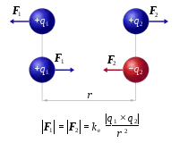 تتناسب القوة الكهروستاتيكية بين اثنين من نقاط الشحنات الكهربائية تناسبا طرديا مع حاصل ضرب الشحنتين، ويتناسب عكسيا مع مربع المسافة بين الشحنتين.