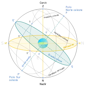 Z سمت الرأس، N النظير،P النجم السماوي الشمالي،P' النجم السماوي الجنوبي,H الشمال، H' الجنوب،E الشرق.