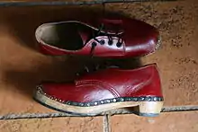 طراز غبسون التقليدي للقبقاب الإنجليزي. مصنوع في لانكشاير. وهناك أنماط مشابهة من القباقيب تصنع في كل مكان من المملكة. لاحظ التنعيل بالبلاستيك لحماية الخشب من الاهتراء والبلى.
