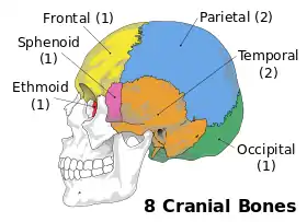 ![]() العظام التماني التي تكون القحف العصبي. | |