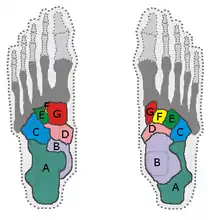 الرسم إلى اليمين نظرة من أعلى القدم، والرسم إلى اليسار نظرة من أسفل القدم :