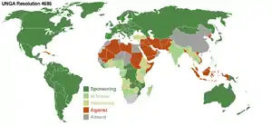 المؤيدون: (111) The sponsoring nations listed above, and additionally: بينين, بوتان, بوتوسوانا, كمبوديا, الكاميرون, كاب فيردي, جمهورية الكونغو, ساحل العاج, فيجي, غابون, هايتي, الهند, كينيا, ليسوتو, مدغشقر, نامبيا, نيبال, نيجيريا, الفلبين, ساو توميه وبرينسيب, سيشل, تايلاند, توغو.
