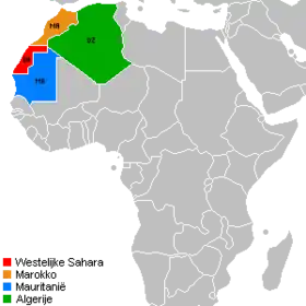 ![]() المغرب (البُرتُقالي)، الصحراء الغربية (الأحمر)، موريتانيا (الأزرق)، الجزائر (الأخضر) المغرب (البُرتُقالي)، الصحراء الغربية (الأحمر)، موريتانيا (الأزرق)، الجزائر (الأخضر) | |