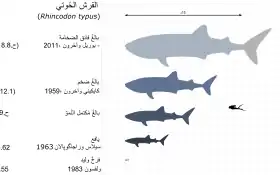 ![]() حجمُ أفرادٍ مختلفةٍ من القرش الحوتي مقارنةٍ بالإنسان حجمُ أفرادٍ مختلفةٍ من القرش الحوتي مقارنةٍ بالإنسان | |