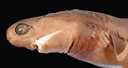 ![]() side view of a slender brown shark with small fins and large green eyes, with a pencil alongside to show that it is of small size | |