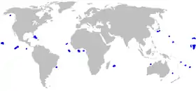 ![]() world map with blue areas scattered through the Atlantic, Indian, and Pacific Oceans, excluding the polar regions Range of the cookiecutter shark | |
