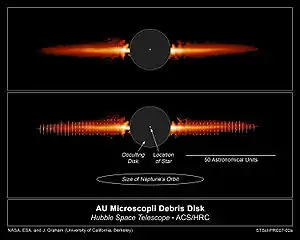 توصف أقراص الحطام المحيطة ببعض النجوم بأنها نوع ضخم من الغبار والحطام الموجود في المجموعة الشمسية. وقد وجد أن معظم أقراص الحطام موجودة على أبعاد بين 10 إلى 100 وحدة فلكية ، وهي تشابه في ذلك حزام كايبر في المجموعة الشمسية، إلا أنها تكون غنية كثيرا بالغبار حول النجوم الأخرى . تحتوي بعض أقراص الحطام على غبار دافيء نسبيا يكون واقعا على بعد نحو 10 وحدات فلكية من النجم، أي أنها تكون قريبة نسبيا من النجم.