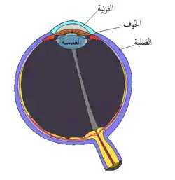 1. الخلط الزجاجي 2. الحاشية المشرشرة 3. العضلة الهدبية 4. النطيفة الهدبية 5. قناة شليم 6. الحدقة 7. الغرفة الأمامية 8. القرنية 9. القزحية 10. قشرة العدسة 11. العدسة 12. النواتئ الهدبية 13. الملتحمة 14. العضلة المائلة السفلية 15. العضلة المستقيمة السفلية 16. العضلة المستقيمة الوسطى 17. أوردة وشرايين الشبكية 18. القرص البصري 19. الأم الجافية 20. شريان الشبكية المركزي 21. الوريد الشبكي المركزي 22. العصب البصري 23. الأوردة الدوارية 24. غمد المقلة 25. بقعة الشبكية 26. النقرة المركزية 27. بياض العين 28. المشيمية 29. العضلة المستقيمة العلوية 30. الشبكية