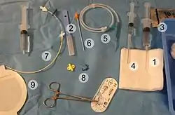4.إبرة إدخال مع محقن بمحلول ملحي لتحديد ما إذا كان هناك إرجاع للدم في الوريد مع عملية الإدخال.