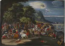 سجل المؤرخ اوساويوس القيصري وبعض المصادر المسيحية الأخرى أن قسطنطين شهد موقعة كبيرة عام 312م في معركة جسر ميلفيو، والتي دعي بعدها قسطنطين بالإمبراطور الأعلى في الغرب. ووفقا لتلك المصادر، فقد نظر قسطنطين للشمس قبل المعركة ورأى صليباً من نور فوق الشمس ومعها كلمات باليونانية: " " ("فز بهذا"، وكثيراً ما حولت للاتينية "in hoc signo vinces"). وأمر قسطنطين قواته بتزين دروعهم برمز المسيحية ( شيرو)، وبعد ذلك انتصروا.