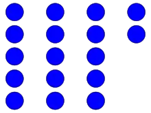 سبعة عشر تُقسم إلى ثلاث مجموعات. كل مجموعة تحتوي على خمس كرات والباقي كرتان. هنا، المقسوم هو سبعة عشر والمقسوم عليه هو خمسة والناتج أو الخارج هو ثلاثة والباقي هو اثنان. لاحظ أن اثنين أصغر قطعا من المقسوم عليه خمسة. من حيث الرموز، 17 = (5 × 3) + 2.