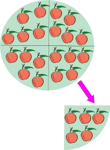 في التعبير ، يسمى a مقسوما أو بسطا، ويسمى b مقسوما عليه أو مقاما, بينما يسمى c خارج القسمة أو ناتج القسمة. يتم وضعه بعد علامة التساوي =.