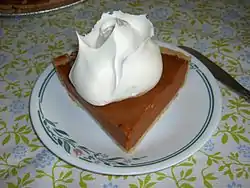 شريحة من فطيرة يقطين يعلوها قشدة مخفوقة.