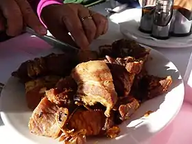قشرة لحم الخنزير طعام من جلد الخنزير.[1][2][3] هي مكون شائع في السجق وهي تساعد في تحسين لزوجتها.