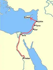 تدور القصة في السنة الخامسة لحكم الفرعون رمسيس الحادي عشر آخر حكام الأسرة العشرين، حول "وينامون" أحد كهنة آمون في معبد الكرنك، الذي أرسله "حيرحور" كبير كهنة آمون إلى مدينة جبيل الفينيقية، لإحضار خشب الأرز لبناء سفينة جديدة لنقل تمثال آمون إلى تانيس. توقف وينامون في ميناء دور التي يحكمها الأمير "بدير"، حيث سُرق. وعندما وصل إلى جبيل، صدم طريقة استقباله بعدائية هناك.
